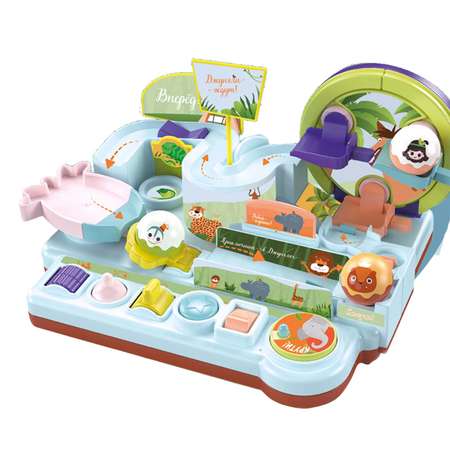 Развивающая интерактивная игра-головоломка со звуками выполнена в виде джунгли, в котором нужно вовремя нажимать рычаги, чтобы машинки преодолевали препятствия на треке. Используя элементы механического управления, малыш без труда справится с прохождением трассы. С помощью пускового устройства можно совершать различные трюки. Игра развивает в ребенке логику, пространственное мышление, воображение, ловкость, реакцию и координацию движений. Играть можно как одному ребенку, так и нескольким сразу.