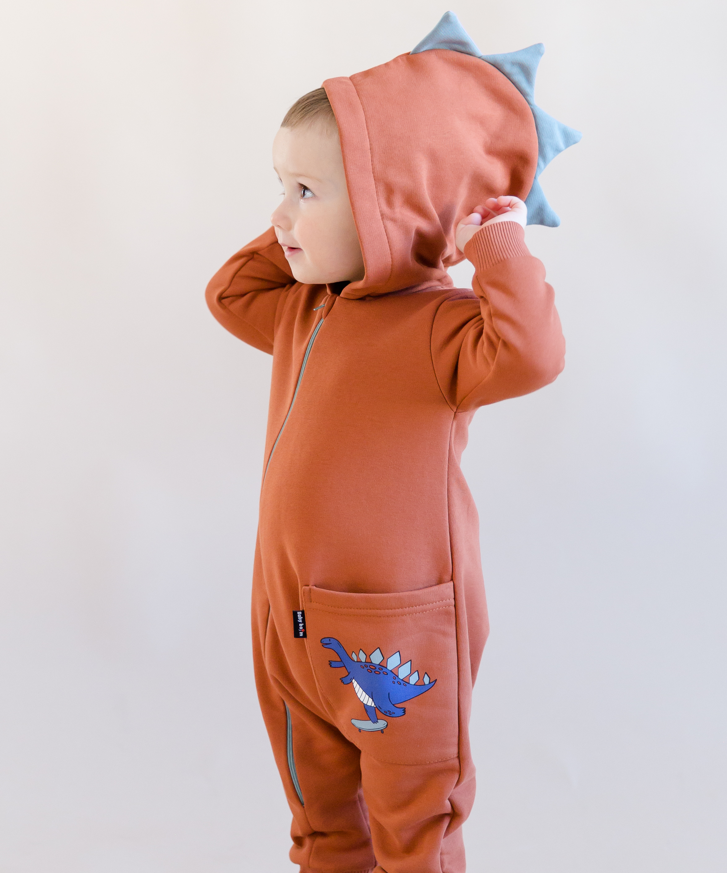 Комбинезон детский с капюшоном, на молнии выполнен из футера 3-нитки с начёсом (плотность 280г/м2), состав 80% хлопок, 20% эластан. Слева по переду расположен накладной карман с принтом. Капюшон на подкладке из кулирки, 100% хлопок, и контрастным гребнем. Размеры 62 и 68 с закрытой ножкой. Размеры 74,80, 86 на манжете.