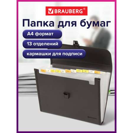 "Папка для документов и бумаг BRAUBERG ""HIT"" – идеальное решение для хранения и транспортировки важных бумаг. С форматом А4 и 13 отделениями, органайзер для документов а4 обеспечивает удобное расположение документов, что особенно важно для работы и учебы. Изготовленная из качественного пластика толщиной 0,7 мм с фактурой под ""ткань"", эта папка для документов семейная не только стильная, но и надежная. Плотный замок защищает содержимое от влаги и пыли, что делает ее незаменимой в деловых поездках и командировках. Индексные ярлыки помогут быстро находить нужные файлы, а строгий черный цвет делает её идеальным выбором для офисных и школьных принадлежностей. Эта канцелярия для школы и офиса станет вашим надежным помощником для упорядочивания документов, обеспечивая долговечность и практичность в использовании.