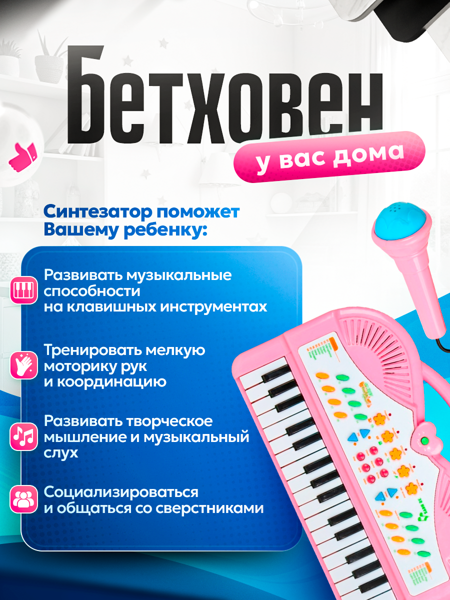 Синтезатор детский имеет компактный размер и удобный дизайн, который позволяет ребенку свободно перемещать игрушку. Клавиши и кнопки подходят для маленьких пальцев, а количество мелодий и настроек ритма позволит ребенку выбрать свою любимую композицию. Детское пианино синтезатор имеет функцию записи и воспроизведения музыки, а также функцию регулировки громкости и темпа. Игрушка прививает первые навыки усидчивости, развивает моторику рук, происходит обучение нотам, развивается слух.
