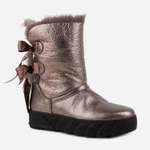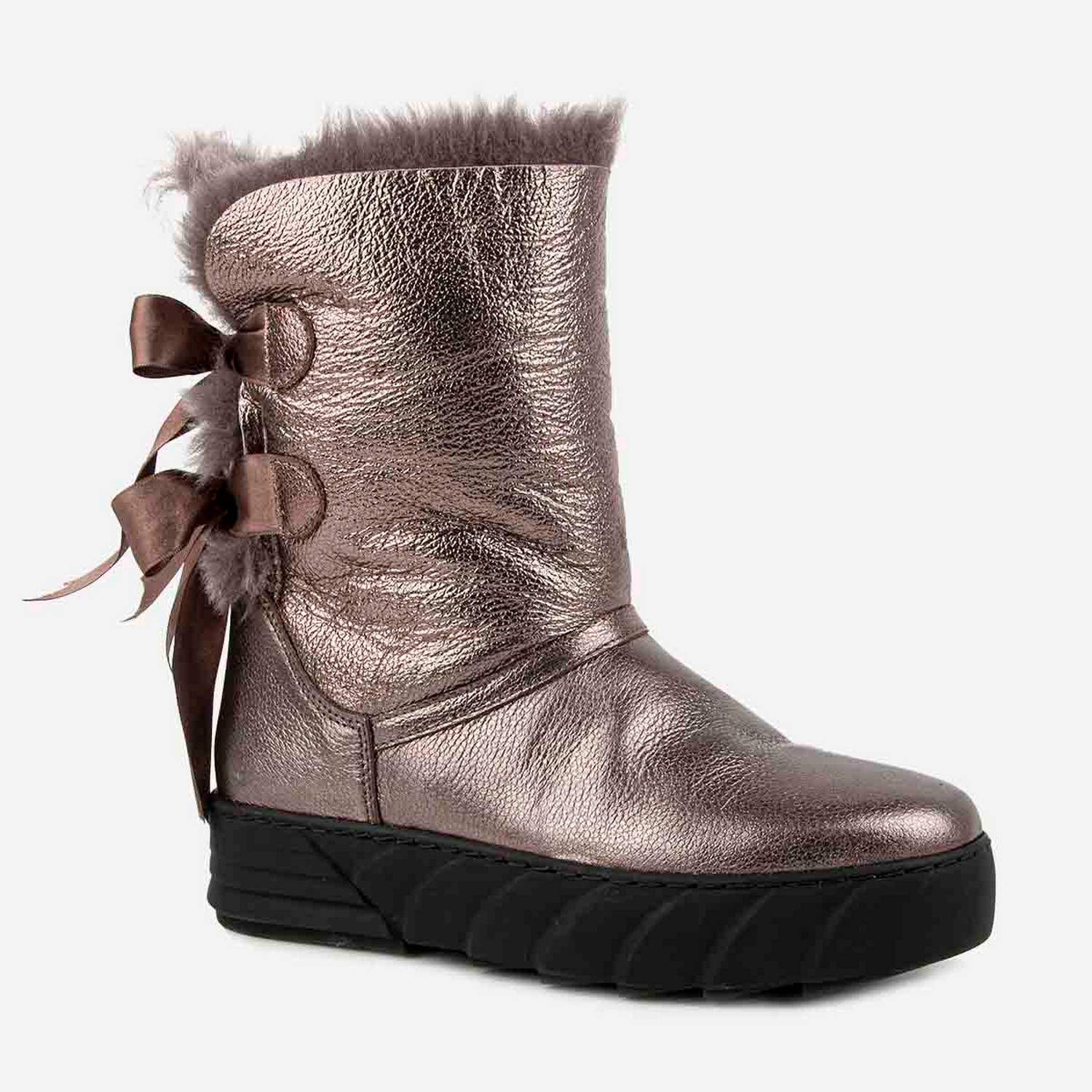 - Очень нарядный внешний вид за счёт дизайна, качества и цвета кожи и конечно игривых бантиком, толстый овечий мех, в том числе стелька покрыта мехом, тёплая толстая подошва защищает от морозов.