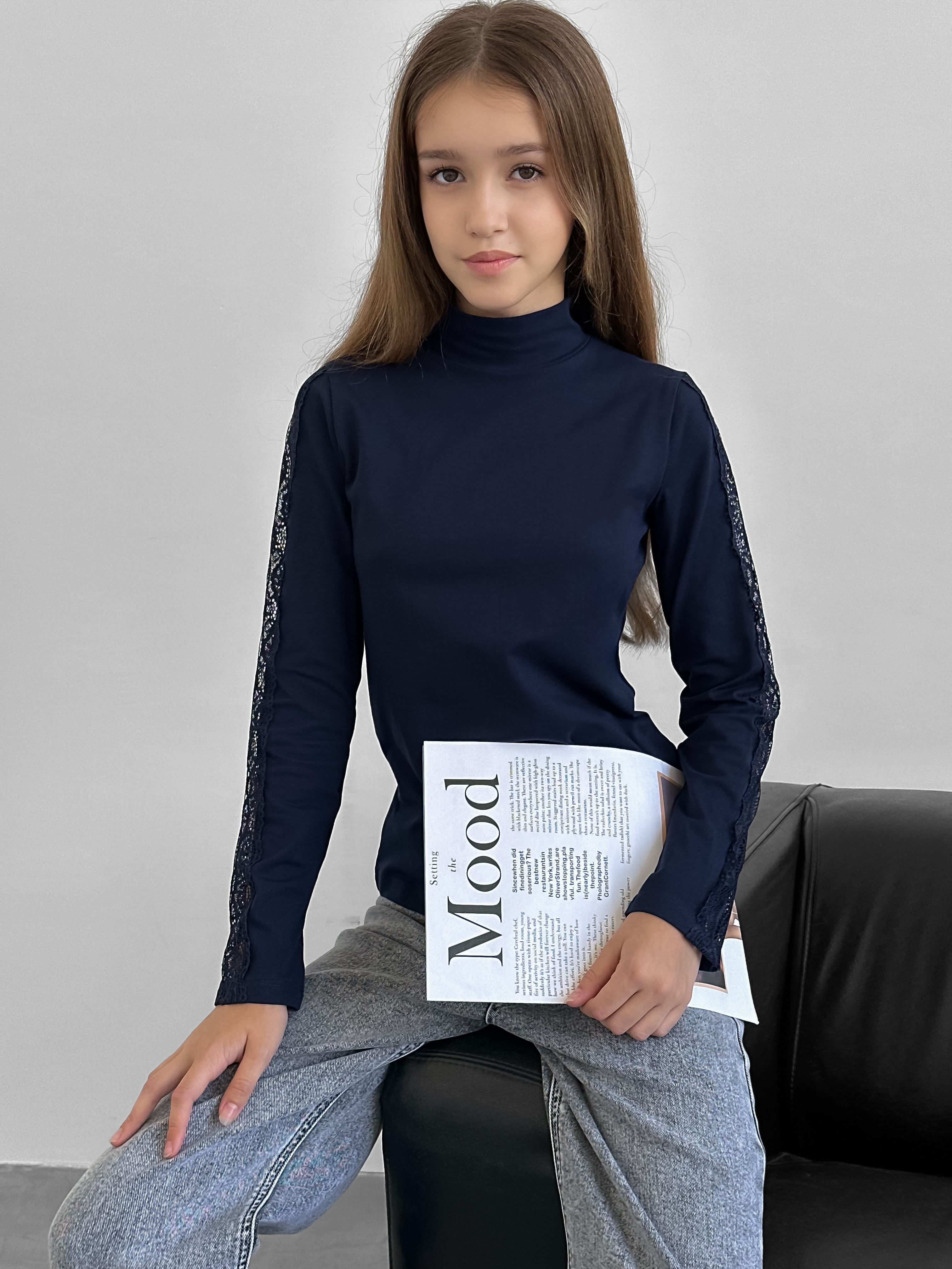 Школьная водолазка для девочки, рукава выполнены из мягкой эластичной сетки. Водолазка для девочки с длинными рукавами и воротником-стойкой. Рукава со вставками из эластичного кружева. Заменит классическую белую рубашку в гардеробе школьницы, ведь бадлон с воротником стойкой сочетается с брючными костюмами, идет под пиджаки и сарафаны. Такая блузка является универсальной моделью, она нарядная и легкая. Носите кофточку кружевную детскую в школу и на прогулки, это отличная повседневная вещь. Также кофта трикотажная ажурная подойдет и для выпускного в садике или линейки на 1 сентября в школе, для занятия спортивными танцами. Гипюровая блузка отличный подарок на день рождения. Лонгслив для девочки это базовая одежда и для маленьких девочек и девушек подростков. Блуза изготовлена из хлопкового материала с лайкрой. Джемпер для девочки с воротником гольф пригодится в весеннее и осеннее время года, а также в прохладные летние дни.