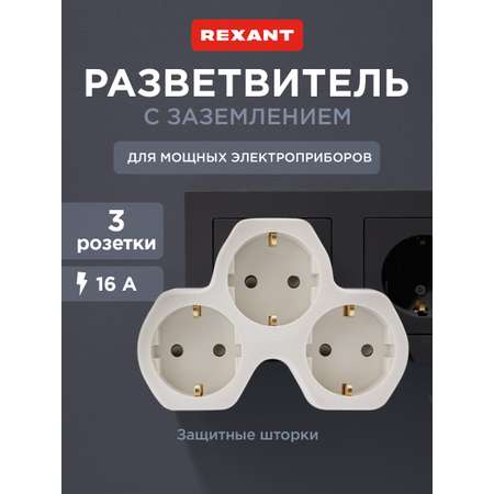 Тройник электрический REXANT с заземлением и защитными шторками белый