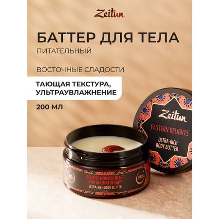 Каждый день наслаждайтесь роскошной бархатистой кожей с ультрапитательными маслами для тела Zeitun, вдохновленными многоликой природой и восточными традициями ухода. Прочувствуйте всю пользу натурального баттера для тела: увлажняющий и питательный эффект, никакой сухости, стянутости, преждевременного старения кожи. Питательный крем-баттер "Восточные сладости" покорит с первого открытия драгоценной баночки, сладостный аромат медовой пахлавы навсегда влюбит вас в ориентальную ароматерапию. Масла кокоса, какао и ши смягчают кожу, интенсивно восстанавливают, насыщают микроэлементами.