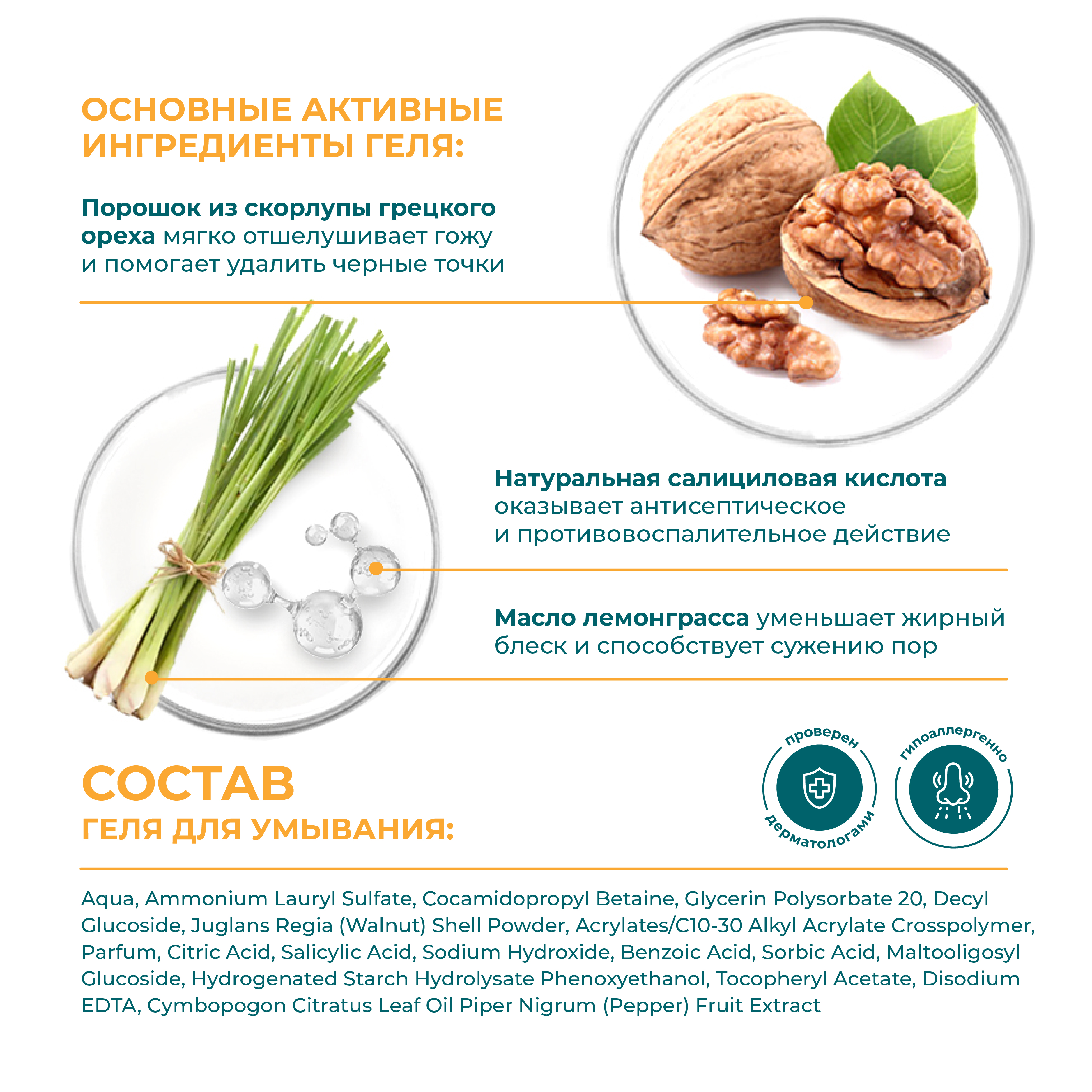 Aqua, Ammonium Lauryl Sulfate, Cocamidopropyl Betaine, Glycerin Polysorbate 20, Decyl Glucoside, Juglans Regia (Walnut) Shell Powder, Acrylates/C10-30 Alkyl Acrylate Crosspolymer, Parfum, Citric Acid, Salicylic Acid, Sodium Hydroxide, Benzoic Acid, Sorbic Acid, Maltooligosyl Glucoside, Hydrogenated Starch Hydrolysate Phenoxyethanol, Tocopheryl Acetate, Disodium EDTA, Cymbopogon Citratus Leaf Oil Piper Nigrum (Pepper) Fruit Extract. Порошок из скорлупы грецкого ореха, натуральная салициловая кислота, масло лемонграсса.