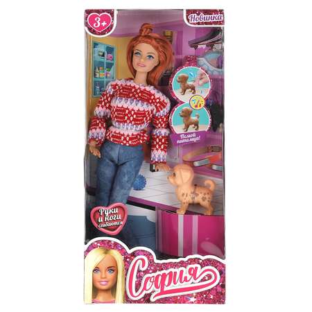 Кукла Карапуз София 29 см руки и ноги сгибаются собака с пятнами и аксессуарами