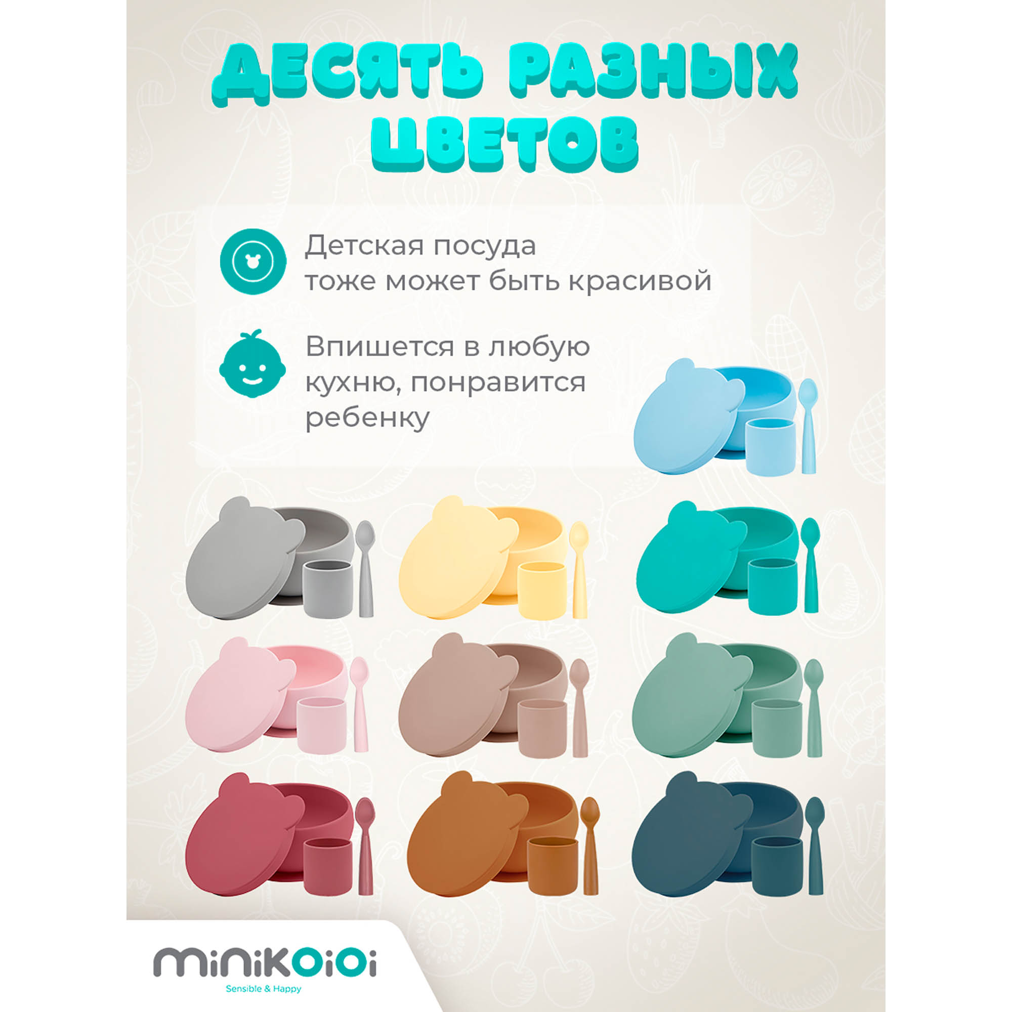 Набор детской посуды MinikOiOi силиконовый из миски стаканчика и ложки