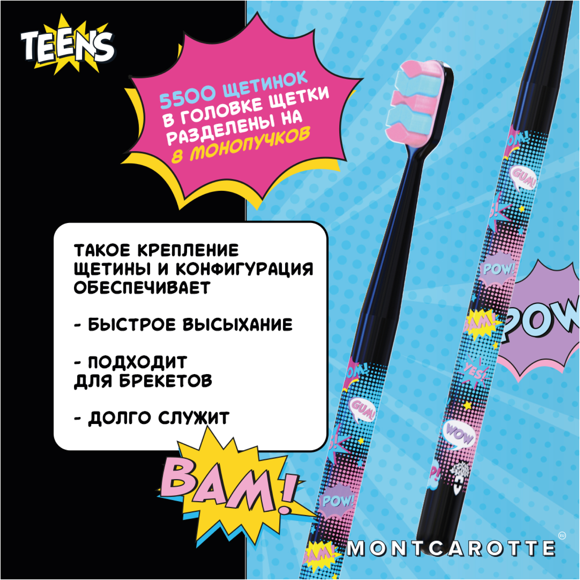 Новая зубная щетка разработана с учетом всех особенностей ухода за полостью рта в подростковом и взрослом возрасте. Форма зубных щеток MontCarotte TEENS выполнена с учетом удобства использования как пациентам юного возраста, у которых происходит смена прикуса, так и взрослым. При производстве зубных щеток MontCarotte TEENS впервые применена уникальная технология имплантирования волокна щетины в головку щетки методом термического крепления, что позволило достичь высокой плотности щетины и максимально надежно закрепить волокно. Зубная щетка MontCarotte TEENS характеризуются максимальным количеством тонких щетинок для атравматичной и безопасной в отношении зубной эмали чистки. Несмотря на супермягкость щетины, эти зубные щетки отличаются потрясающим качеством и скоростью очищения зубной поверхности от зубного налета и пищевых накоплений. Волокно щетины подходит даже самым чувствительным пациентам, страдающими аллергическими реакциями.