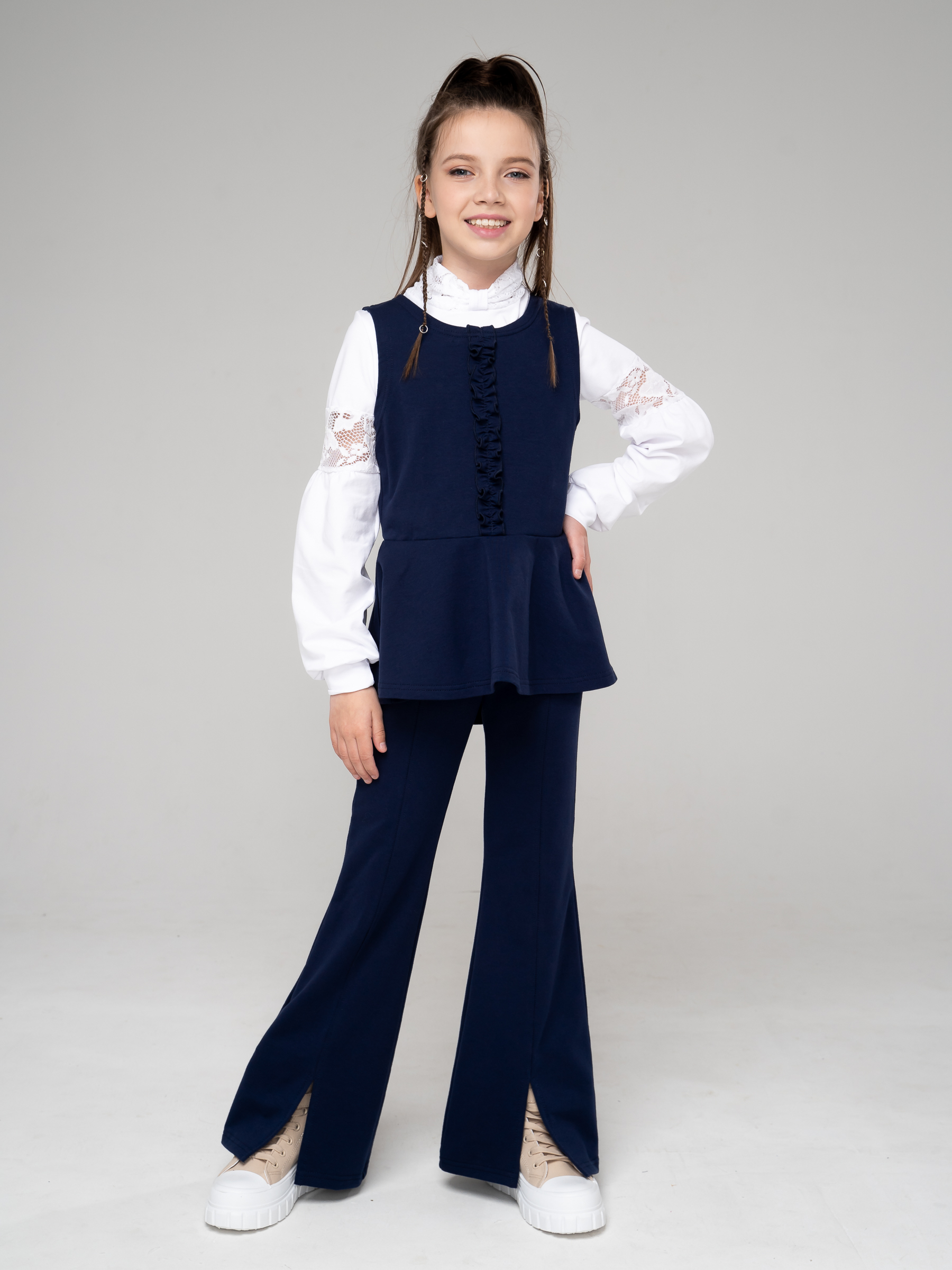 Костюм школьный для девочки на 1 сентября! Детский костюм-двойка состоит из жилета и брюк - клеш, из футера, для девочки. Жилет с баской отрезной по линии талии. По центру полочки - отделка в виде узкой рюши. Баска асимметричного кроя, немного удлиненная сзади. Штаны клеш для девочки, облегающие по бедрам и расклешенные от колена. Спереди по центру - рельефный шов с элегантным разрезом внизу. Пояс на эластичной резинке. Костюм для школы выполнен из трикотажа премиального качества - ПЕНЬЕ, с содержанием хлопка более 92%. Брюки клеш - тренд 2022 - 2023 года! Клеш можно носить отдельно, прекрасно подойдут белая блузка, рубашка, футболка. Жилет можно сочетать с юбкой, любыми брюками и даже шортами. Удобный синий костюм отлично подойдет девочкам как школьная форма, костюм на 1 сентября. Брючный костюм для школы, клеш для девочки, детские брюки, синие брюки для школы, в школу на 1-е сентября, форма для девочки, повседневные штаны клеш.