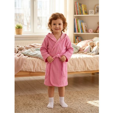 Мягкий махровый халат незаменим в повседневной жизни ребёнка: хлопковый халат из тонкого одностороннего махрового полотна на запах очень удобен в бассейне, бане и после душа и подойдёт как халат для девочки. Плотность ткани 180 г/м², тонкие петельки только с внешней стороны делают изделие лёгким, но хорошо впитывающим влагу и удерживающим тепло.