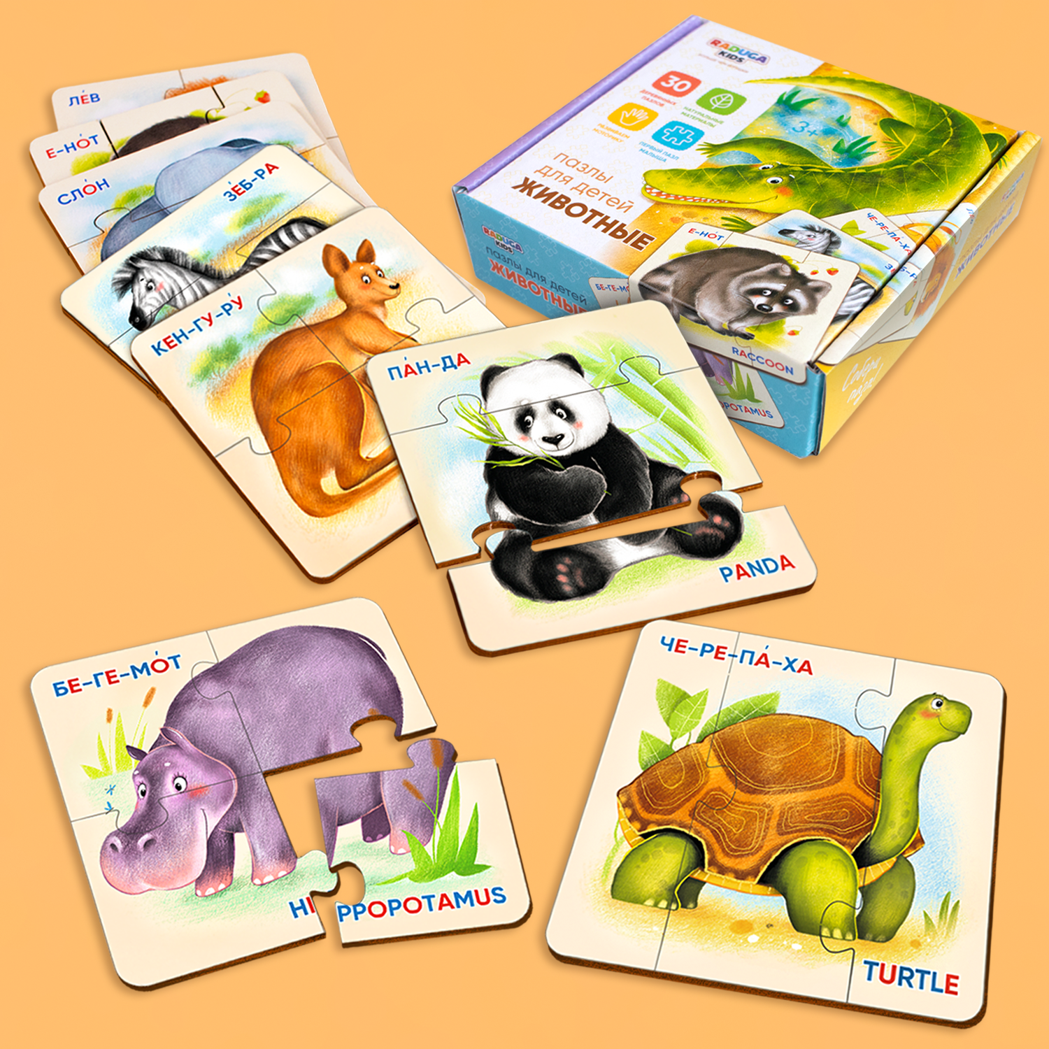 Игрушка помогает развивать логическое мышление, мелкую моторику рук и память. В процессе игры можно изучать названия животных на русском и английском языках (например: «слон – elephant»), а также задавать вопросы: «Кто где живет?», «Кто что ест?» или «Какой звук издает это животное?». Такой интерактивный подход способствует расширению словарного запаса у детей.Развивайте наблюдательность через игру мемори: найдите лишнее животное среди африканской фауны (подсказка — это енот!). Это также отличный способучитьребенка быть внимательным к деталям.Обучающие карточки подойдут не только для дома, но и как монтессори игрушки в детских садах или развивающих центрах. Пазлы можно использовать в тематических занятиях по окружающему миру или логике. Развивающие игрушки для детей 1 2 года разнообразят будни ребенка и подарит много свободного времени его родителям!