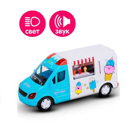 Машинка "Кафе на колёсах" оснащен инерционным механизмом, у него открываются двери и багажник. В специальное отверстие можно закинуть игрушечную монетку, на крыше расположена специальная кнопка, при нажатии на которую активируются проблесковые маячки и звуковые эффекты.