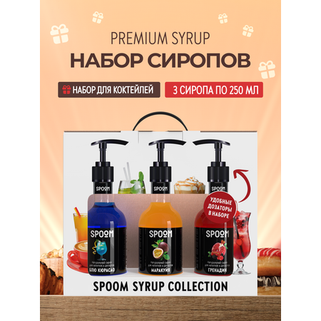 Набор сиропов Spoom для коктейлей и лимонадов в фирменной упаковке - это отличный подарок для себя и своих близких. Набор состоит из 3 бутылочек сиропов со вкусами Блю Кюрасао, Гренадин, Маракуйя, объемом 250 мл каждая. Также в набор входят 3 шт помпы-дозатора в подарок.