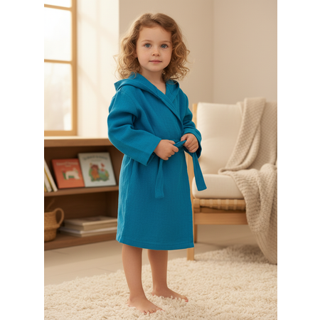 Приятный бирюзовый цвет универсален и подойдёт и мальчикам, и девочкам, а капюшон помогает сохранить тепло после душа или бассейна. Такой махровый халат идеален для бассейна и других спортивных секций, где обязательна душевая, а также для использования дома после ванны