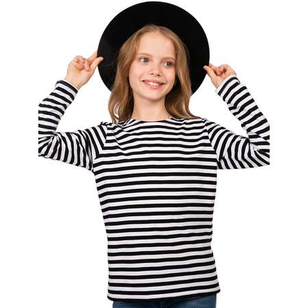 Лонгслив для девочки с длинным рукавом в черную полоску изготовлена из высококачественного кулирного полотна, состоящего на 100% из хлопка, плотный гладкий трикотаж дополняется вязаной полоской, что отличает модель от любых похожих вещей.