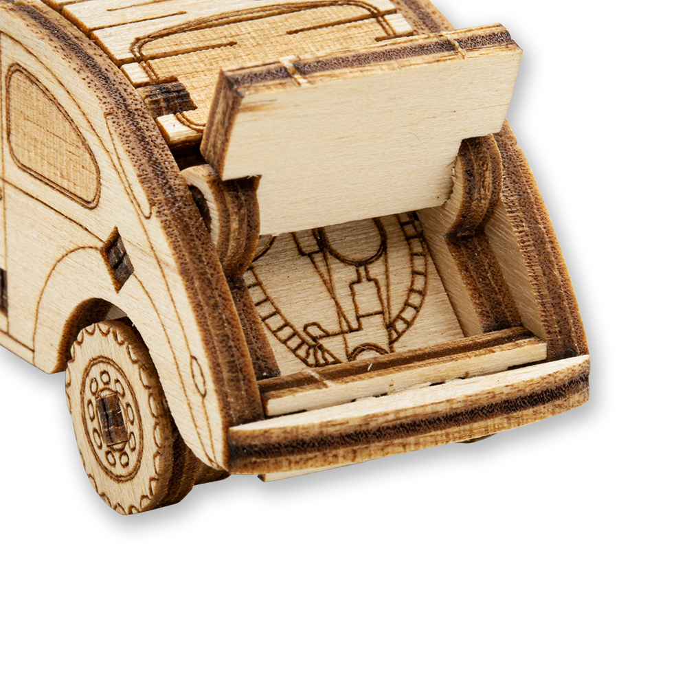 - БАГ (30 деталей) - миниатюрный конструктор-автомобиль, при разработке которого мы ориентировались на знаменитый Volkswagen Käfer, он же Фольцваген Жук. Инженеры UNIWOOD постарались сохранить все узнаваемые детали корпуса.