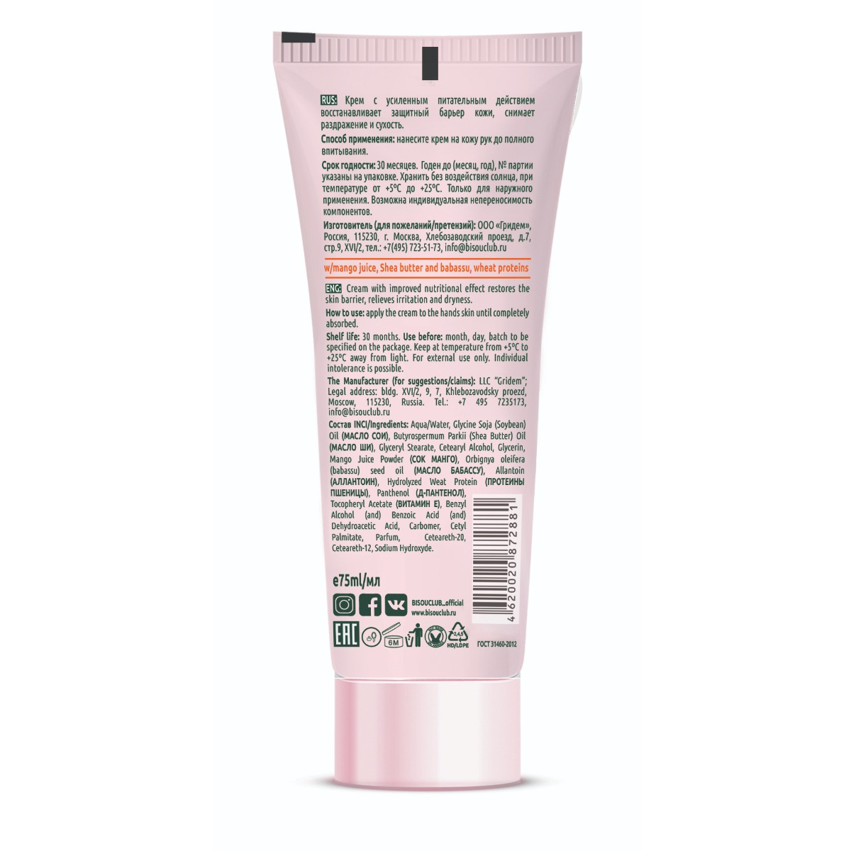 Сок манго, масла ши и бабассу, протеины пшеницы. Крем для рук предназначен для глубокого питания и увлажнения. Подходит для использования в межсезонье и зимой. Содержит ценные масла Ши и Бабассу. Натуральный Сок Манго обогащает кожу витаминами.