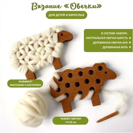 Состав: Деревянная овечка - массив бука, клубочек натуральной шерсти - 100% меринос, деревянная игла, инструкция.