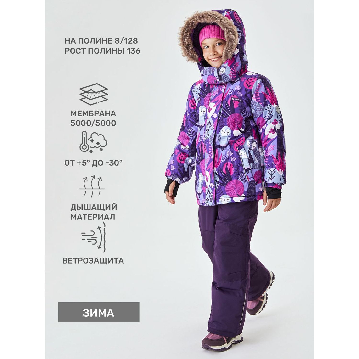 Теплый комплект отлично подойдет для холодной осени и морозной зимы. Мембранная ткань защитит от дождя и ветра, имеет грязеотталкивающий эффект. Стильный дизайн поможет выделиться в толпе, как малышу, так и девочке подростку.