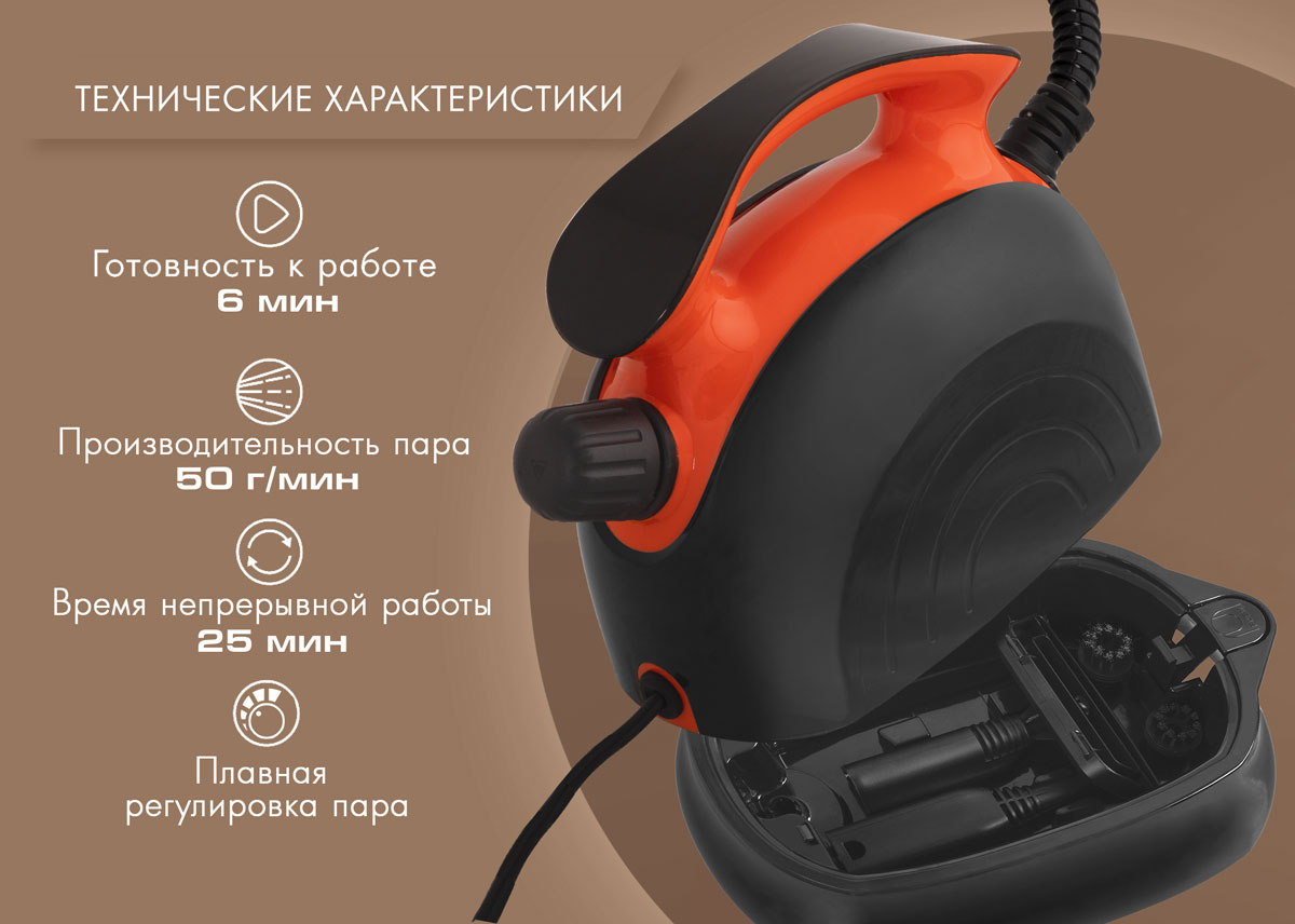 Полный комплект насадок обеспечит эффективную очистку и дезинфекцию любой поверхности., Удобен в эксплуатации: можно повесить на плечо, носить в руке или поставить на пол., Индикация готовности пара и отсутствия воды в баке., Температура пара достигает 100°С, что позволяет делать дезинфекцию без специальных химических средств., Защита от детей предотвращает возможные травмы, связанные с использованием прибора., Отсек для хранения мелких аксессуаров.