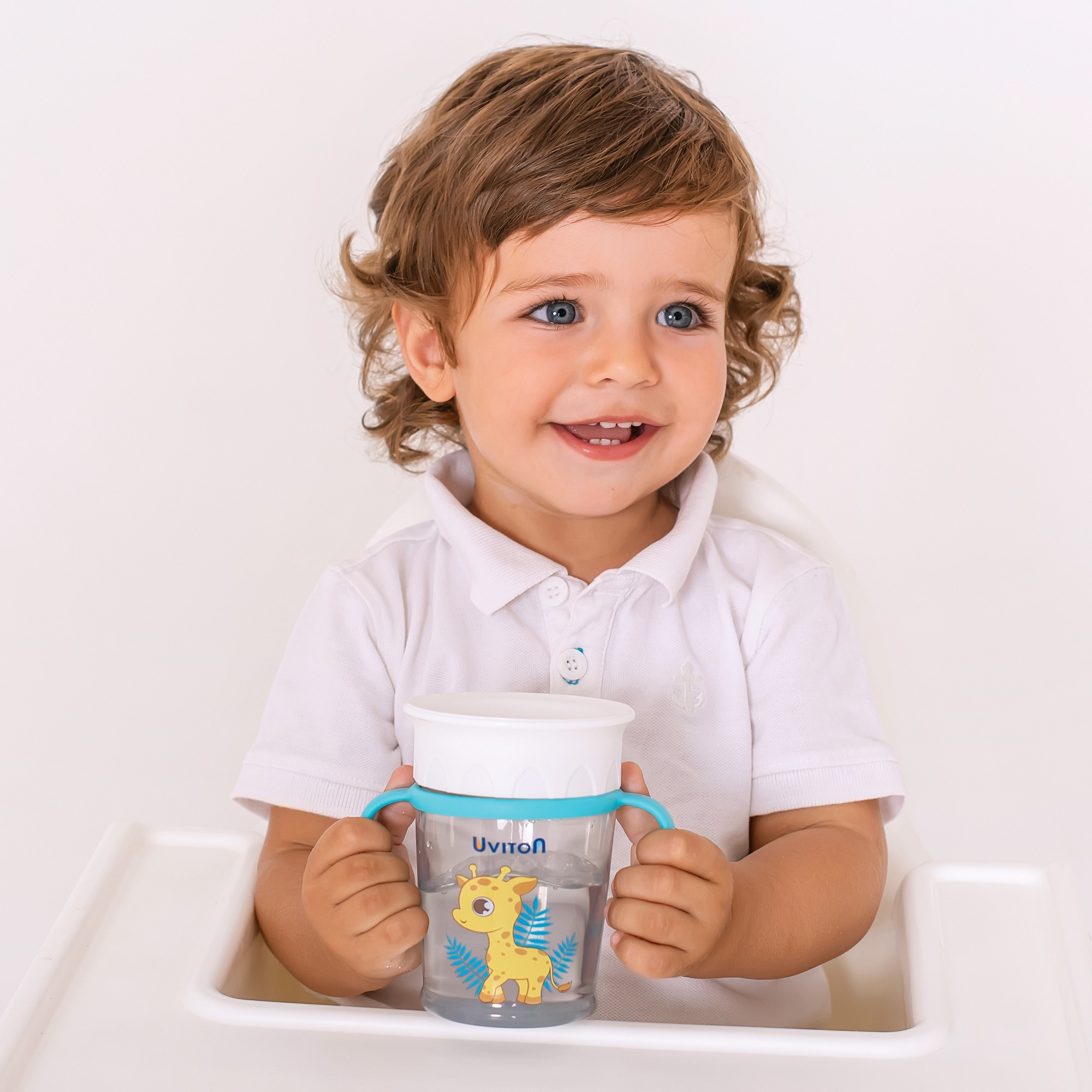 Поильник непроливайка 360 тренировочный для детей от Uviton Чашка непроливайка позволит малышу легко и быстро привыкнуть пить с края как из обычной кружечки. Пить напиток можно по всей окружности - жидкость равномерно распределится под крышкой, под каким бы углом ребёнок не наклонил его. Удобно брать с собой в коляску, автомобиль. Этот обучающий поильник предотвращает любые проливания напитков, а также благодаря мягкому и гибкому материалу бережет зубы и десны малышей. в отличии от поильник с трубочкой ваш малыш не прогрызет накладку. Такая технология без горлышка позволяет быстрее приучить малыша к взрослой чашке. Подходит для воды, смеси и сока ,температурой не выше 40 С. Не используйте с напитками с мякотью или газированных напитков. Не позволяйте ребенку кусать или грызть клапан, это может нарушить герметичность конструкции. После наполнения поильника прижмите силиконовую мембрану по всей окружности, чтобы выпустить лишний воздух и обеспечить герметичность. Мыть и сушить в разобранном виде (открутите крышку, потяните силиконовый клапан, чтобы его снять). Периодически снимайте силиконовое кольцо-уплотнитель, чтобы очистить его и крышку. Можно мыть в посудомоечной машине на верхней полке. Для комфортной чистки используйте ершики для мытья поильников и бутылочек. Не кипятить, не обдавать кипятком/паром, не использовать в СВЧ. Производитель допускает одну стерилизацию с помощью кипятка перед первым использованием для очищения деталей - для этого промойте детали поильника мягким моющим средством, вскипятите воду, снимите с огня, поместите детали поильника в воду на 5 минут, аккуратно достаньте, дайте остыть и тщательно просушите в разобранном виде. Постоянная стерилизация горячими методами запрещена. Чтобы поильник прослужил Вам как можно дольше, пожалуйста, следуйте рекомендациям по уходу. Все наши товары для новорожденных, бутылочки для кормления, бутылки для воды и поильники сертифицированы и имеют сертификат качества. Милый рисунок подходит для девочек и для мальчиков. С 12 месяцев, с 1 годика.