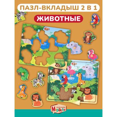 Пазл состоит из 12 деталей. Вкладыши имеют удобные деревянные ручки для легкого захвата. Все детали изготовлены из качественного древесного материала, тщательно обработаны и безопасны для игр. Малыши смогут изучать цвета и знакомиться с различными животными, что делает процесс обучения увлекательным.