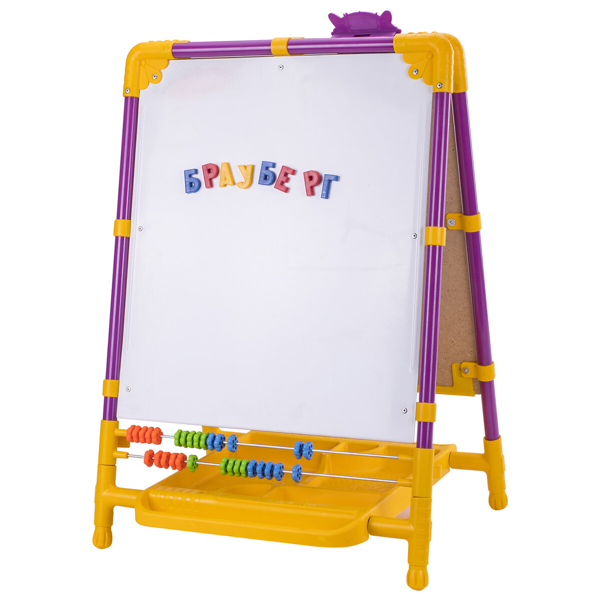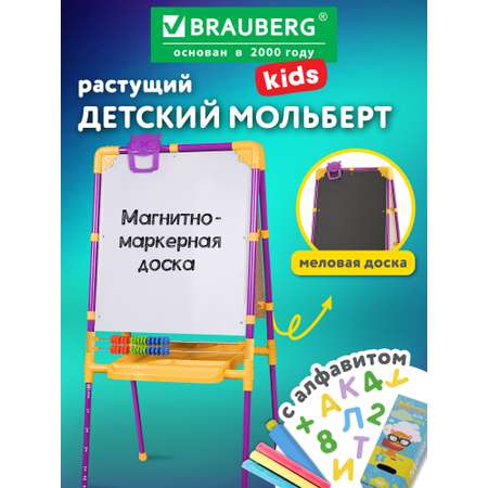 "Мольберт растущий двусторонний BRAUBERG NIKA KIDS станет идеальным выбором для развития творческих способностей вашего ребенка. Металлическая рамка в приятном сиреневом цвете и рабочие поверхности 53х46 см делают его отличным решением для обустройства игрового пространства как дома, так и в детских учреждениях. Одна сторона мольберта представляет собой белую маркерную доску, которая также является магнитной, что позволяет использовать магниты и развивать навыки письма и счета. Вторая сторона - черная меловая доска, на которой можно рисовать мелками.