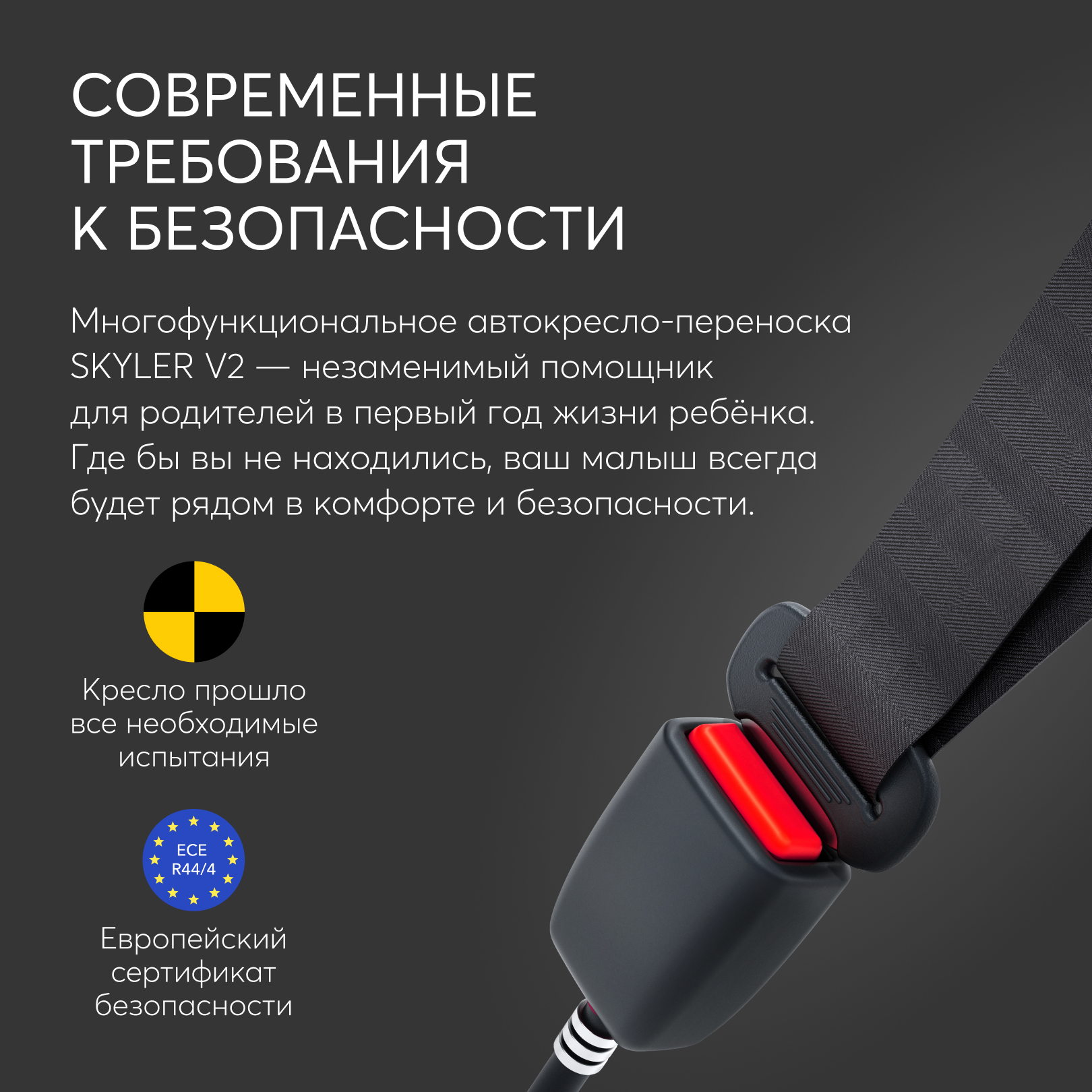 Элегантный внешний облик и стильный дизайн делают многофункциональное автокресло переноску SKYLER V2 незаменимым помощником для мамы в первый год жизни малыша. Где бы Вы не находились, ваш малыш всегда будет рядом в комфорте и безопасности. Ультралёгкий вес люльки и удобная ручка для переноски делают путешествия с малышом легким и простым. Мягкий анатомический вкладыш обеспечивает дополнительный комфорт во время поездки. Съемный капюшон защищает ребенка от солнца, а удобная ручка позволяет без лишних усилий переносить ребенка, как в обычной люльке. Надежная боковая защита позволяет повысить уровень безопасности при боковых ударах. Благодаря полукруглому основанию удобно укачивать малыша, в качестве ограничителя качания можно использовать ручку переноски, опустив ее вниз до упора. Мягкий дышащий вкладыш устойчив к истиранию, прекрасно держит форму при смятии. Тканевый чехол прост в уходе, при необходимости легко снимается для стирки. черная пятница / скидки / акции