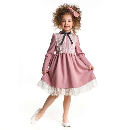 Платье для девочки (розовое),платье нарядное для девочки.Выполнено из ткани барби, 35%хлопок, 65%полиэстер. Крой отрезной по талии с защипами книзу, длинный рукав на широких манжетах под пуговицы, высокая горловина. Несквозная застежка на спинке (молния). Декорировано деталями из кружев (рюшевая оборка по подолу и композиция кружевная накладка + бант-галстук на груди). Подходит как вариант праздничной одежды для дошкольных и домашних мероприятий.