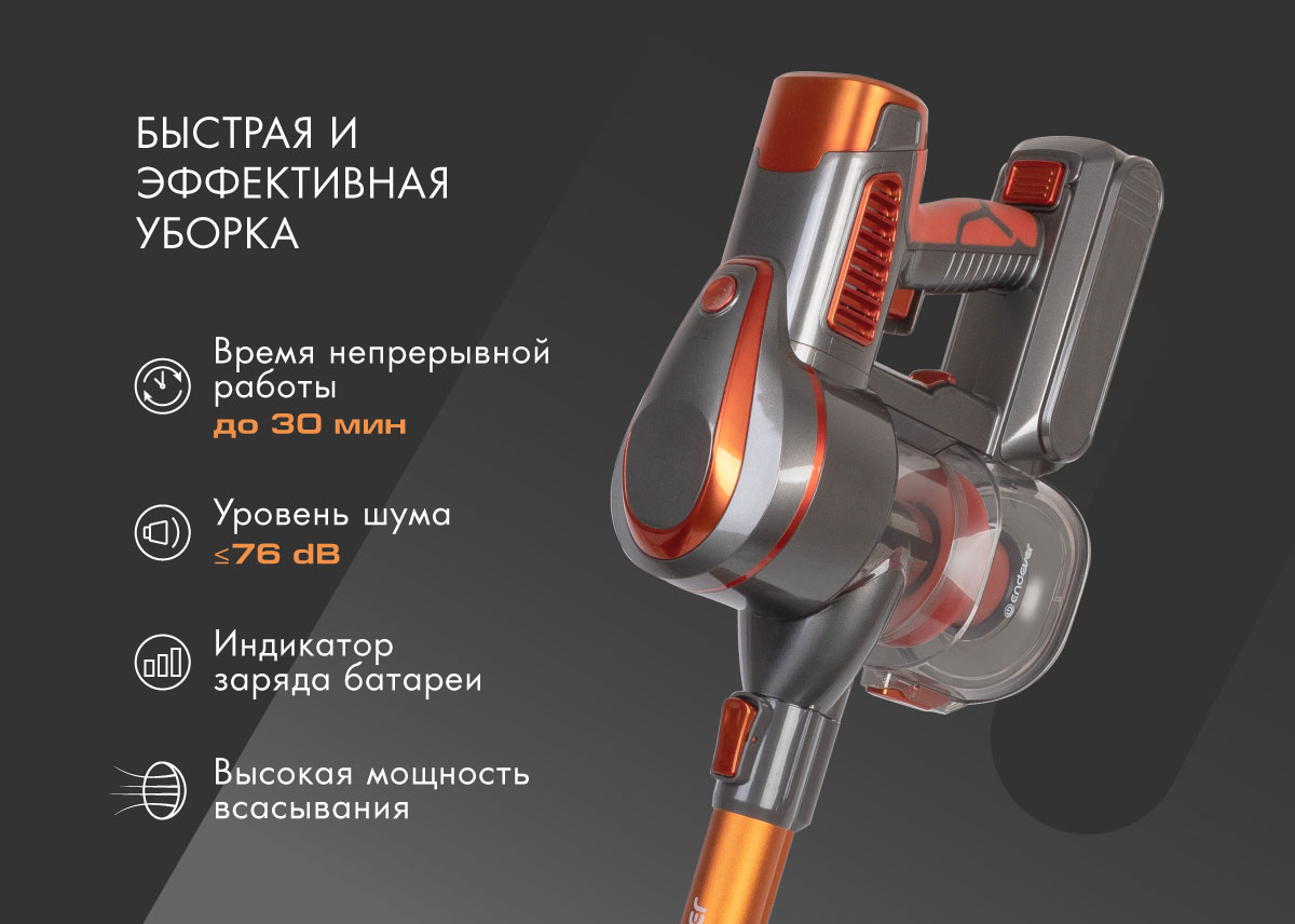 Тип: беспроводной, Моющийся HEPA-фильтр, 2 двигателя, 2 скорости работы, Конструкция 2 в 1: ручной и вертикальный, Индикатор заряда батареи, Моющийся съемный контейнер пылесборника, Высокая мощность всасывания, Светодиодная подсветка, 2 насадки в комплекте