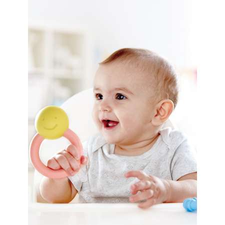• СТИМУЛИРУЕТ СЛУХОВЫЕ И ТАКТИЛЬНЫЕ ЧУВСТВА: счастливое лицо мягко хрипит при встряхивании, стимулируя слуховое восприятие ребенка. В то время как мягкие цвета и прикосновение стимулируют остроту зрения и поощряют тактильные исследования.