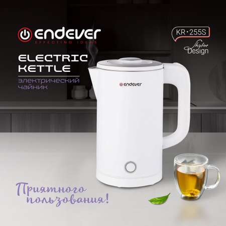 Мощность электрочайника 2200 Вт и оптимальная емкость 1,7 литров быстро и качественно вскипятит для Вас воду, времени для этого нужно не более 5 минут, после чего даже многочисленная компания, собравшись за одним столом, может насладиться ароматным чаем. Endever Skyline KR-255S –техника для кухни, в которой применена технология двойного корпуса. Внешняя сторона корпуса выполнена из термостойкого пластика, благодаря чему, корпус остается холодным. Внутренняя часть электрочайника сделана из высококачественной нержавеющей стали 304, это гарантирует безопасность, кроме того, в процессе кипячения в этом чайнике, вода не изменит свой вкус и не приобретет посторонних запахов.