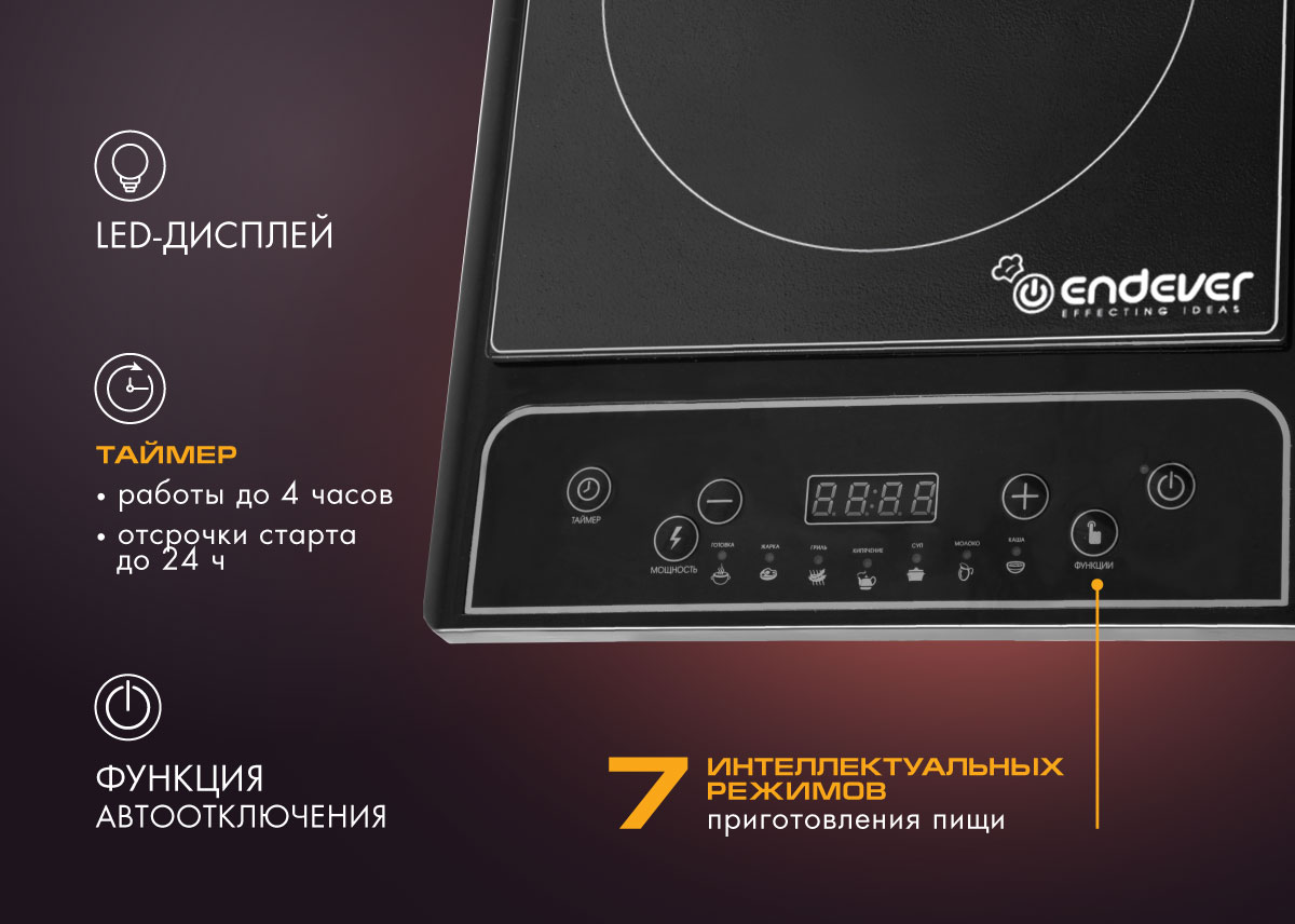 7 автоматических программ индукционной плиты ENDEVER Skyline IP-22 позволят использовать по максимуму все ее возможности. Поможет в этом таймер работы до 4 часов и таймер отсрочки старта до 24 часов, Вам не потребуется следить за процессом готовки и начать готовить, когда Вам нужно.