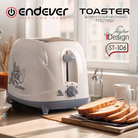 Электрический тостер ENDEVER SkyLine ST-106 - Ваш помощник на кухне на каждое утро, ведь с ним вы приготовите хрустящие тосты в одно мгновение. 2 отсека для загрузки хлеба будут полезны тем, кто готовит завтрак на несколько членов семьи, поскольку одновременно можно приготовить сразу два тоста. 7 степеней поджаривания помогут приготовить тосты из разного по толщине и составу хлеба. Вы всегда подберете нужную степень поджаривания. А съемный трафарет в виде двух сердечек для рисунка на тосте порадует даже самых маленьких членов Вашей семьи. Функция отмены будет полезна, когда потребуется прервать процесс поджаривания, не дожидаясь завершения.
