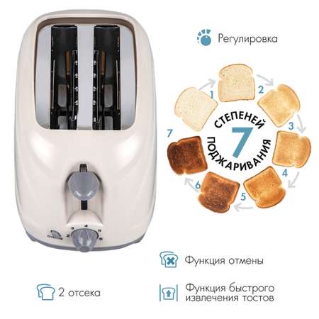 7 режимов поджаривания, Функция автоматического центрирования, 2 отсека для тостов, Рисунок на тосте, Отсек для хранения шнура, Поддон для крошек, Прорезиненные ножки, Функция отмены, Термоизолированный корпус