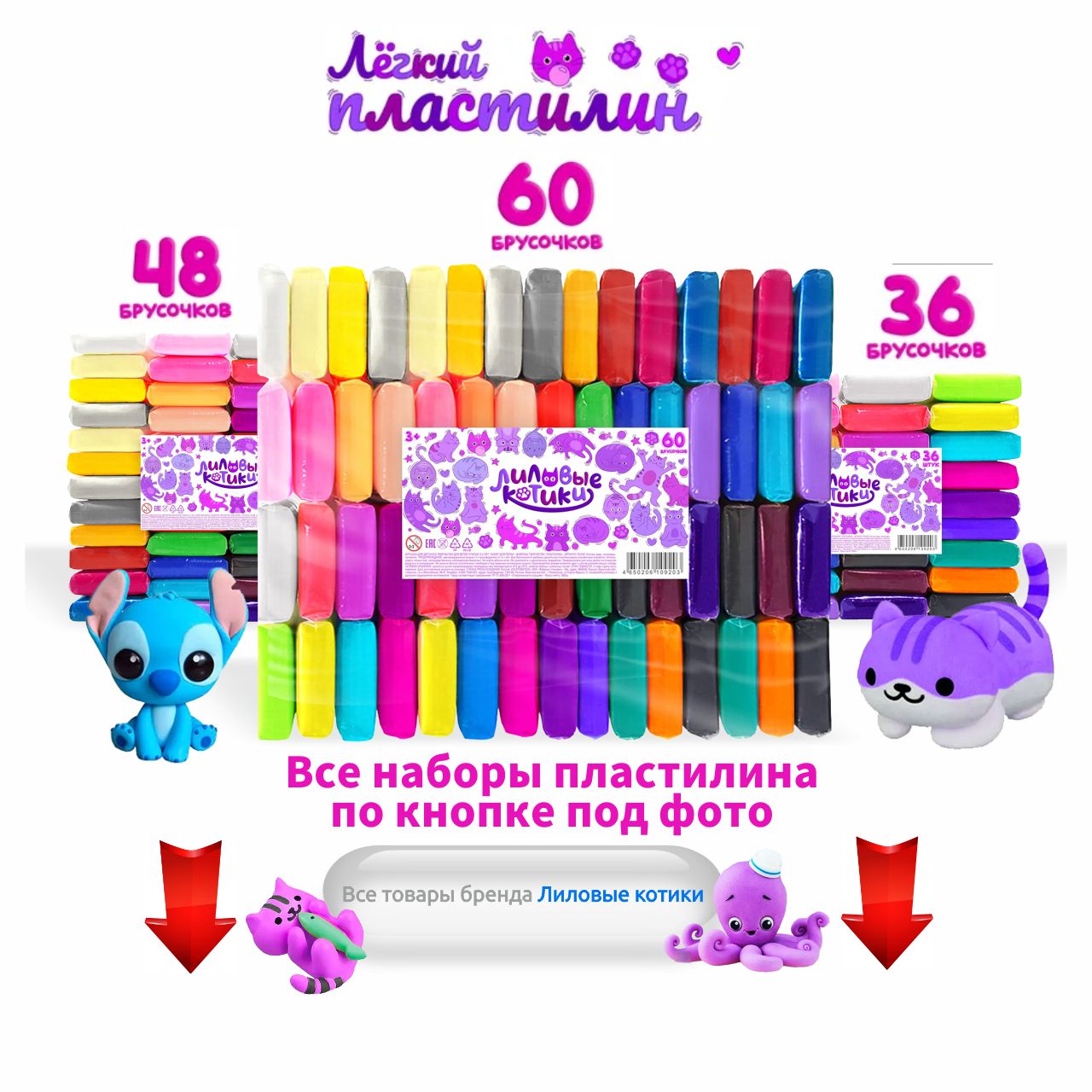 Легкий воздушный пластилин представлен в вариантах наборов - по 24, по 36, по 48 и 60 штук, выбирайте какой Вам нужен.