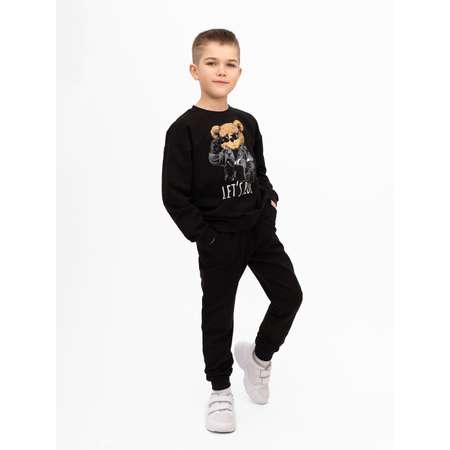 Костюм для мальчика. Черный костюм. Комплект для девочки на весну/лето. Брюки на широкой резинке в поясе и со шнурком для лучшей регулировки по размеру. По бокам карманы, сбоку декоративная бирка флажок. Джемпер с длинными рукавами. Горловина обработана эластичным кантом, сзади киперная лента от растягивания. Манжеты на рукавах и штанинах, низ джемпера из эластичного, мягкого трикотажа. Костюм выпускается в однотонном цвете, передняя сторона джемпера украшена стильным принтом.