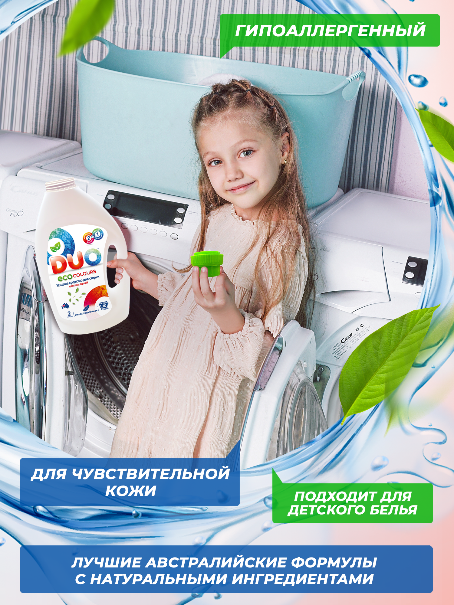 Экологичное гипоаллергенное жидкое средство для стирки DUO ECO COLOURS предназначено для стирки цветных вещей, а также стирки детского белья от 1 года.