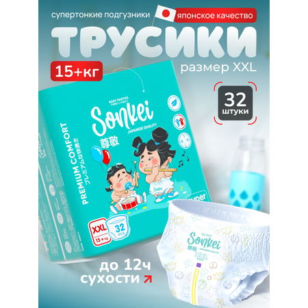 Подгузники трусики 6 размер XXL для новорожденных детей 15+ кг /32 шт / Sonkei / Сонкей / Ночные / Ультратонкие / Японские подгузники / Детские памперсы / для мальчиков и девочек