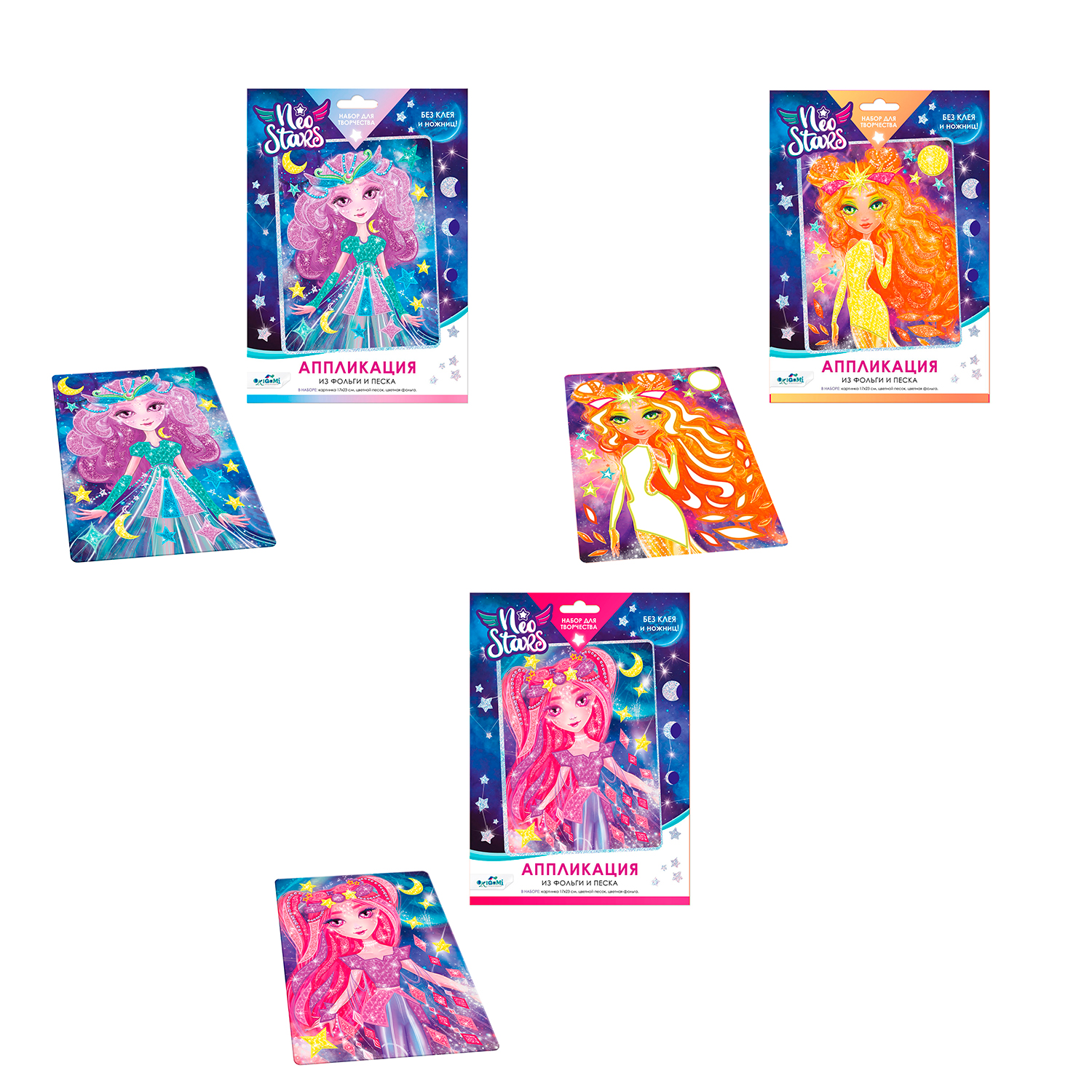 Создайте 3 яркие аппликации из фольги и песка в космическом дизайне Neo Stars! Для этого снимите защитный слой с детали, которую хотите раскрасить, насыпьте песок и потрите пальчиком. Чтобы закрасить остальные элементы, приложите блестящую фольгу, потрите обратной стороной карандаша и уберите остатки. Занятия аппликациями отлично тренируют мелкую моторику ребенка, усидчивость и аккуратность, а также развивают творческое мышление и фантазию. Готовыми картинками можно украсить детскую комнату. Увлекательное творчество без клея и ножниц!