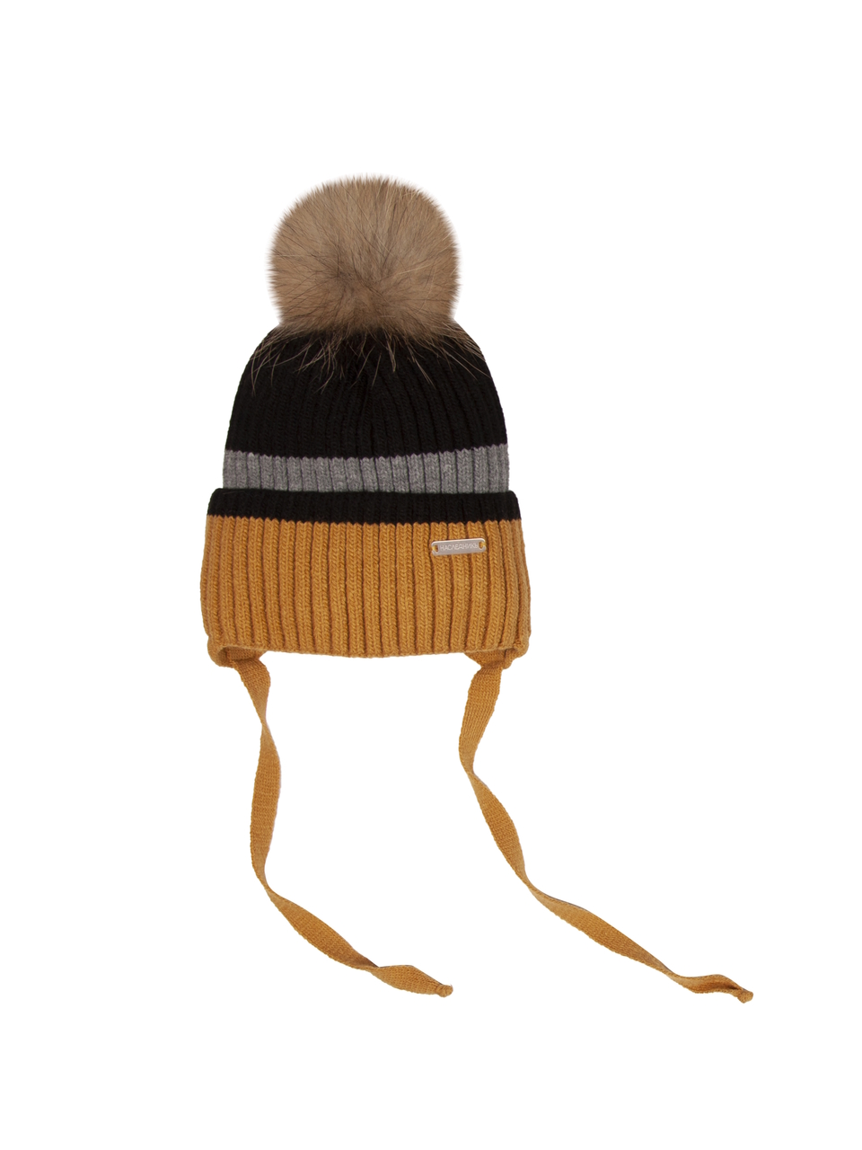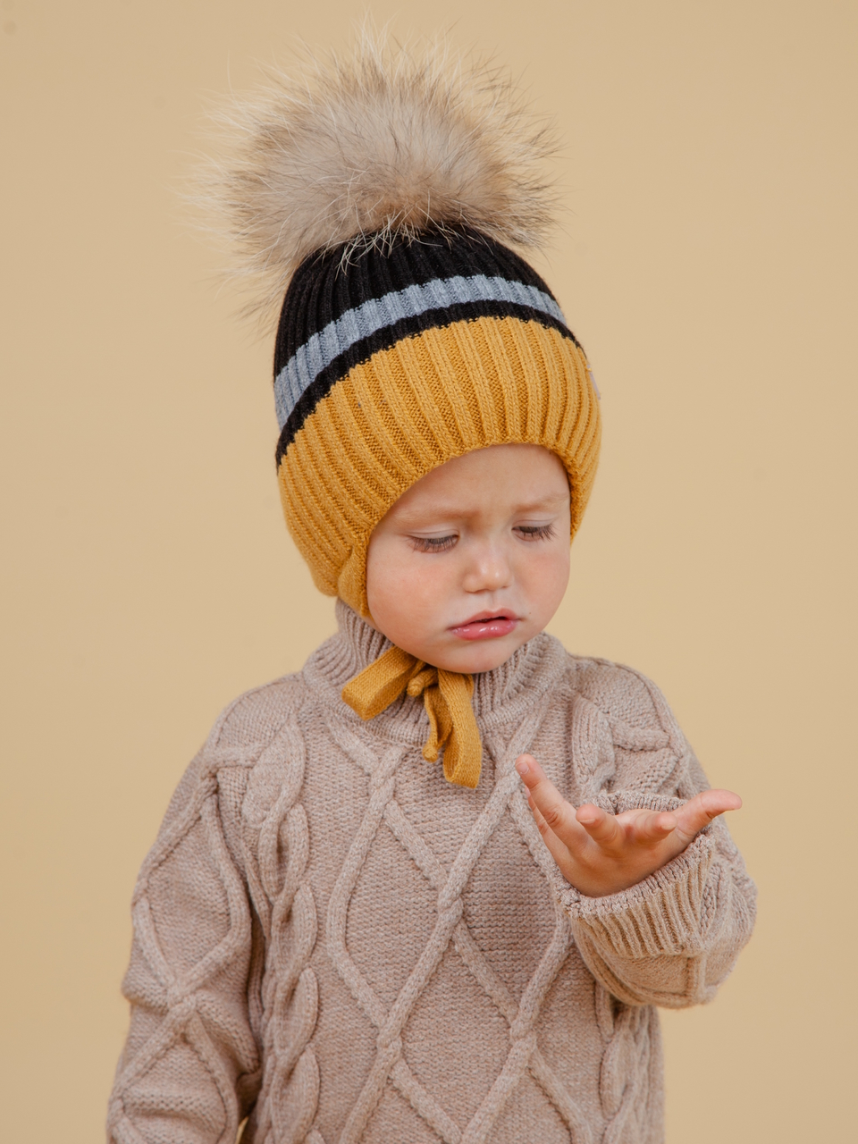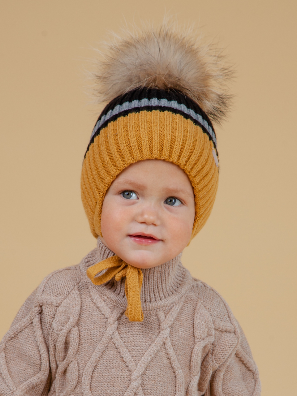 Детская зимняя шапка для малышей, для мальчиков и для девочек с помпоном из натурального меха на завязках. Вязанная детская шапка из шерсти мериноса 40% и пана 60% с хлопковым подкладом и утеплителем термофином. Шапка отлично сидит на голове, хорошо закрывает уши, защищает от холода и ветра. Шапка не сползает на глаза и позволяет комфортно проводить время на улице. Шапка предназначена на зимний сезон. Состав:40% Шерсть, 60% Пан , нат. мех песец ,Подкладка: 95% Хлопок, 5% Эластан,Утеплитель : Термофин.Цвет: Горчично-черный.