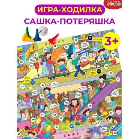 Игрокам нужно помочь маме найти потерявшегося ребёнка. Сашка-потеряшка тот ещё озорник! Пока мама ищет его в огромном супермаркете, мальчик вовсю развлекается: прыгает на батуте, притворяется игрушкой, катается в лифте и даже летает на воздушных шарах. На игровой дорожке детей подстерегает много клеточек-сюрпризов, приятных и не очень: дополнительные ходы, движение по стрелкам вперёд или назад и, конечно же, пропуски хода.