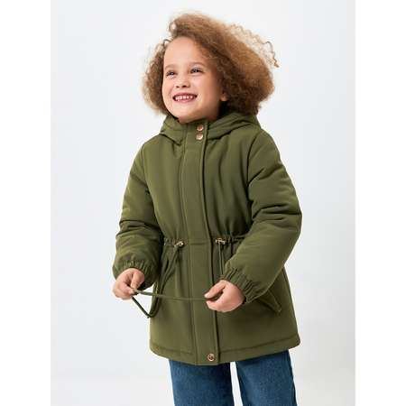 Утепленная куртка цвета хаки для межсезонных прогулок от 5 до -10 С. А-силуэт легко становится приталенным, если затянуть шнур на талии - две куртки в одном. Внешняя планка застёгивается на потайные и внешние кнопки, минимизируя видимые украшения. Два прорезных кармана закрываются клапаном на кнопке, чтобы не потерялись важные детские вещи. Глубокий капюшон и резинки на рукавах прячут от ветра, а вышивка крыльев сверкающими пайетками зовет в полет.