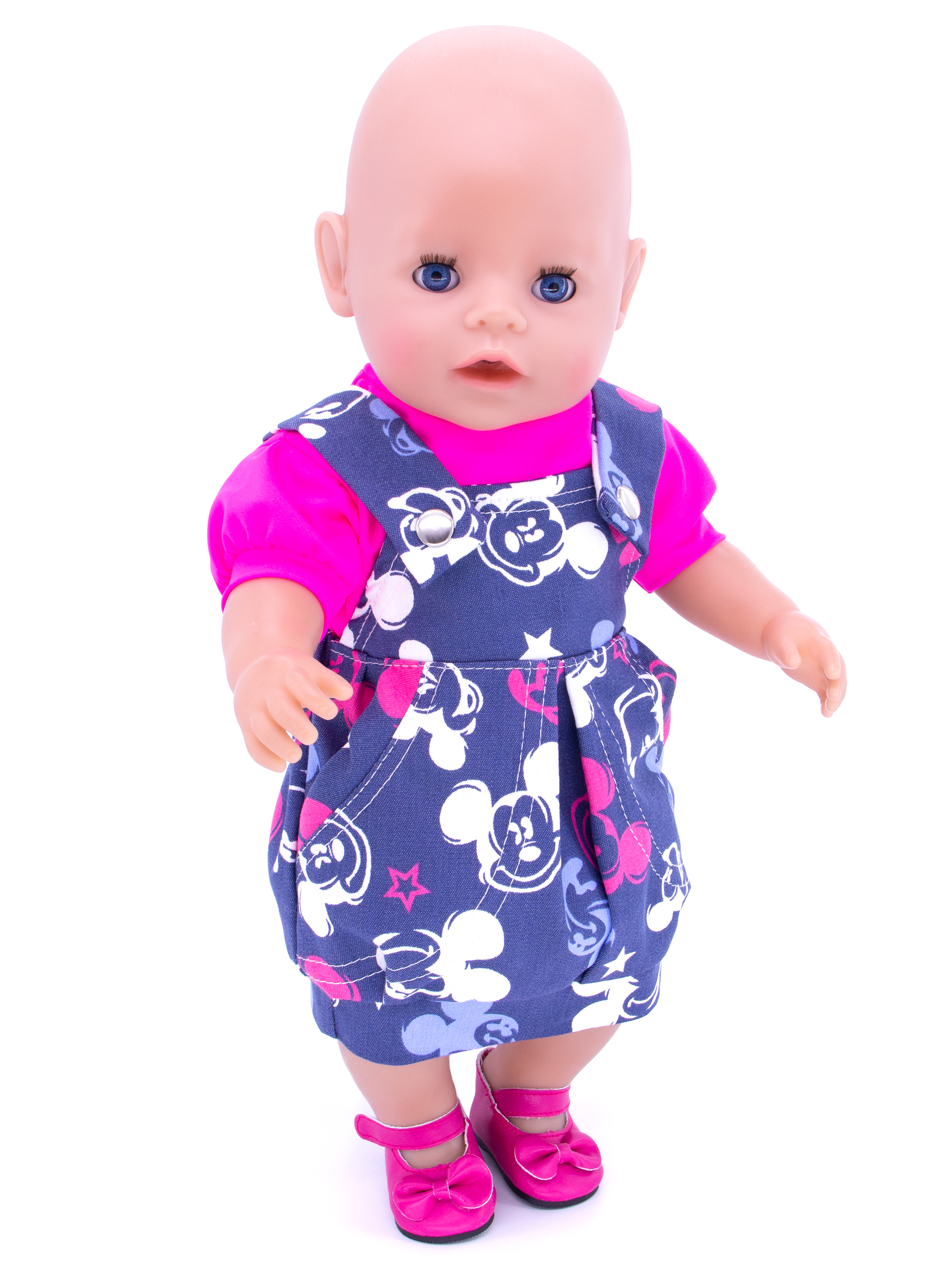Комплект одежды для кукол до 45 см. В комплекте сарафан для куклы из джинсовой ткани с карманами. На поясе сарафан на резинке, что позволяет его беспрепятственно одевать и снимать. Сарафан на лямочках, которые застегиваются спереди на кнопки, что позволяет Вашему ребенку их легко застегивать и расстегивать. К сарафану прилагается футболка из мягкого трикотажа. Одевать её удобнее через голову пупса. Рукавчики футболки на манжете. В такой удобной и нарядной одежде для куклы Ваша любимица может пойти на летнюю прогулку, в гости или просто играть дома. Подойдет для пупсов ростом до 45 сантиметров с объемом бедер 28-32 см, объемом груди 28-32 см, объемом талии 28-32 см, объемом головы 30-34 см, длиной ножки 6 см. Обратите внимание! Кукла и аксессуары не входят в комплект! В нашем магазине представлен широкий ассортимент товаров для детей. Нажмите на название магазина "Модница" Выберите соответствующую категорию. Или же введите в поиске одежда для кукол или одежда для кукол Модница.