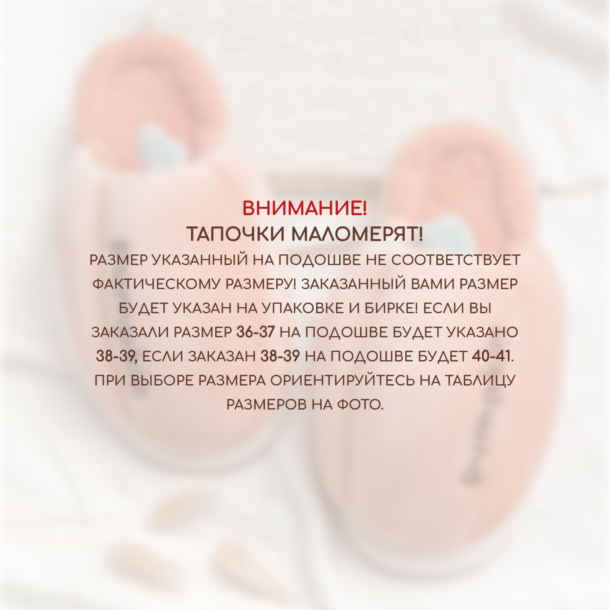 ВНИМАНИЕ! ТАПОЧКИ МАЛОМЕРЯТ! РАЗМЕР УКАЗАННЫЙ НА ПОДОШВЕ НЕ СООТВЕТСТВУЕТ ФАКТИЧЕСКОМУ РАЗМЕРУ! ЗАКАЗАННЫЙ ВАМИ РАЗМЕР БУДЕТ УКАЗАН НА УПАКОВКЕ И БИРКЕ! ЕСЛИ ВЫ ЗАКАЗАЛИ РАЗМЕР 36-37 НА ПОДОШВЕ БУДЕТ УКАЗАНО 38-39, ЕСЛИ ЗАКАЗАН 38-39 НА ПОДОШВЕ БУДЕТ 40-41. ПРИ ВЫБОРЕ РАЗМЕРА ОРИЕНТИРУЙТЕСЬ НА ТАБЛИЦУ РАЗМЕРОВ НА ФОТО.