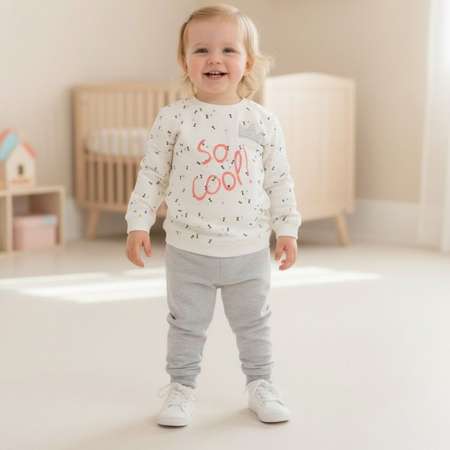 Спортивный костюм для малышей ЦВЕТ : МОЛОЧНЫЙ С ПРИНТОМ , БРЮКИ СЕРЫЕ . Детский спортивный костюм из футера (2-нитка) Наш трикотажный костюм — это универсальный комплект, состоящий из мягкой толстовки и удобных штанишек. Мы создали спортивный костюм для малышей с заботой о самых маленьких, используя премиальный 100% хлопок (двунитка). Ткань одежды для новорожденных из хлопка гипоаллергенна, приятна к телу и позволяет коже «дышать», не вызывая раздражений даже у новорожденных. Кофта костюма в садик для девочек оснащена эластичными манжетами на рукавах, а штанишки — мягкой резинкой на поясе и манжетами снизу. Это обеспечивает трикотажному комплекту двунитка идеальную посадку и надежно защищает от прохладного ветра. Для удобства переодевания на маленьких размерах демисезонной детской одежды предусмотрены кнопки на плече. Большие размеры детской одежды (2 последних в линейке) идут без кнопок, что соответствует потребностям подросших детей. Костюм демисезонный. Он станет незаменимым в прохладные летние вечера, костюм для малыша подойдет для детского сада, дома и прогулок осенью или весной. Домашняя одежда для девочек. При соблюдении режима бережной стирки костюм сохраняет форму и яркость цвета, выдерживая активные игры и частые стирки. Спортивный костюм детский представлен в универсальном крое , поэтому комплект одежды для детей отлично подойдет для девочек. Трикотажный костюм прекрасный и полезный подарок на выписку, день рождения или просто без повода.