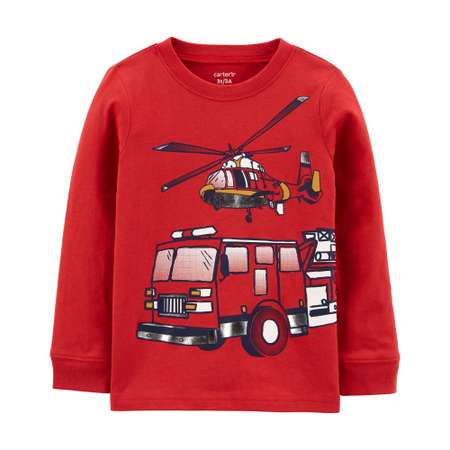 Лонгслив красного цвета с широкими манжетами на рукавах и принтом Пожарная техника. Горловина хорошо тянется, но не растягивается. Низ джемпера прямой.
