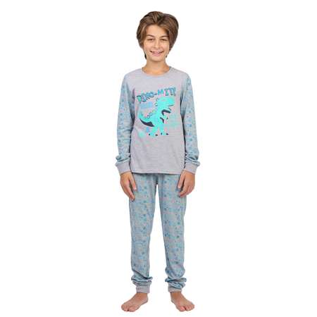Пижама для мальчика серого цвета - декорированы цветным принтом с динозаврами, изготовлена из качественного кулирного полотна, состоящего на 100% из хлопка мягкая на ощупь, приятная для тела, хорошо пропускает воздух и создает комфортный микроклимат для кожи в любое время года.