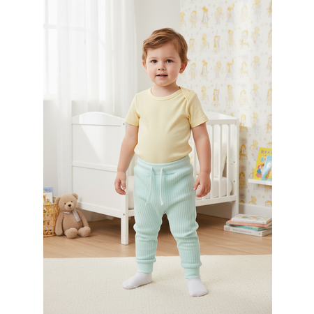 Особенности модели: ясельные штанишки. Мягкий пояс с тонкой резинкой и трикотажными завязками. Манжеты на штанинах. Штанишки однотонного цвета либо с контрастным оформлением пояса и манжет.