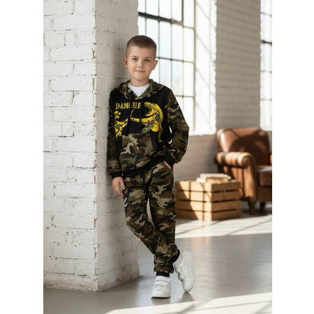 Костюм для мальчика. Камуфляж. Спортивный костюм для мальчика - удобный и качественный демисезонный наряд, состоит из брюк – джоггеров и кофты с капюшоном свободного кроя с принтом, цвет хаки. Для производства данной модели использовался мягкий, легкий и приятный к телу футер 2-х нитка с лайкрой без начеса. Носить костюм всесезонный можно при любой погоде – холодным летом, теплой осенью, весной или зимой, под верхний слой одежды. Комплект прекрасно подойдёт для занятий физкультурой в школе, путешествий и повседневной носки. Костюм для мальчиков удобен на любую фигуру. Примечательно, что оба предмета при желании можно сочетать с прочей одеждой и носить по отдельности. Благодаря манжетам и резинкам на рукавах и штанинах комплект подходит для разной длины рук и ног. Костюм для мальчика— это отличный подарок на день рождения и другие праздники, такой презент будет ежедневно напоминать о вашей любви и заботе. Костюм детский прост в уходе - мы рекомендуем предварительную стирку при 30 градусах. Т.к. изделие включает в себя контрастные цвета, рекомендуем использовать порошки и гели для цветных вещей. Вы можете посмотреть весь ассортимент одежды нажав на логотип бренда Утенок. Собственное производство в РФ.